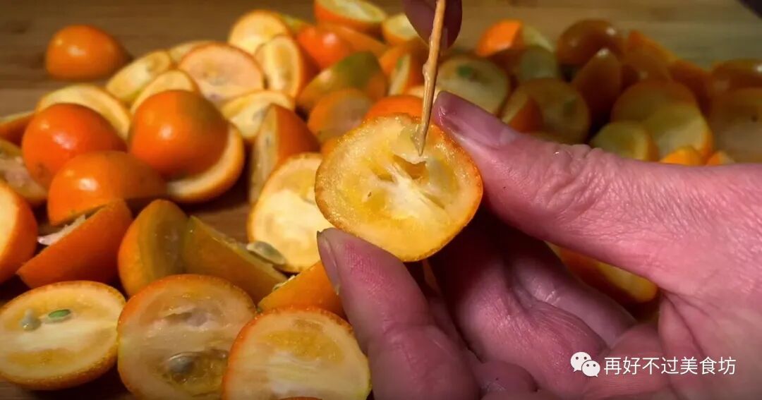 4、全部切好之后,用牙签把金桔里面的籽都挑出来,这样吃的时候就方便多了,而且金桔籽里有一种苦味,最好不要吃。
