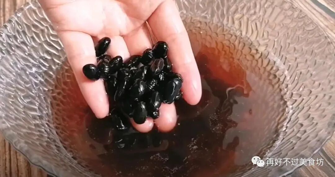 4、先将黑豆在水中浸泡三个小时以上,方便等下我们熬煮,浸泡过后,水会变成棕红色,大家不必担心,这属于正常现象。