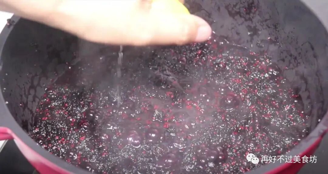 5、等煮到有些粘稠了,就加入20毫升柠檬汁,改最小火继续煮,要不停搅拌,煮至水分差不多收干就可以了。