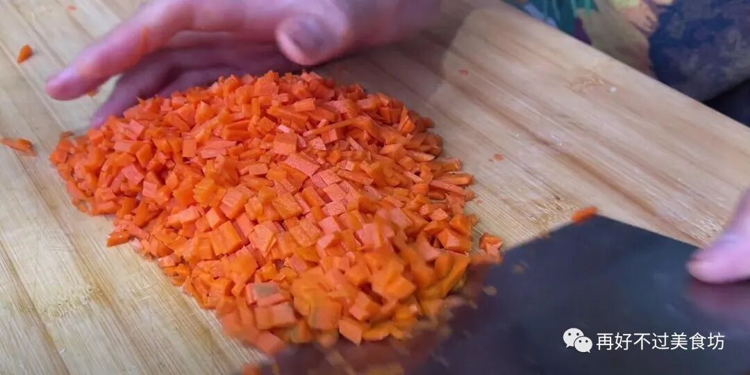 6、准备一根去了皮的胡萝卜,先是改刀切成片,再给它切成丝,最后给它切成小丁,切好后,放入碗中备用。