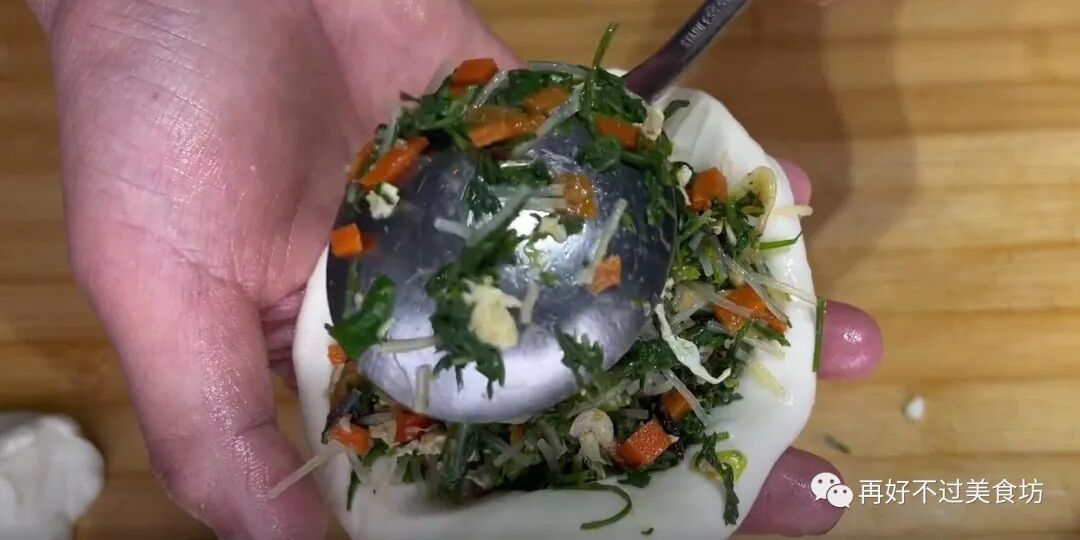 14、叠好后放在案板上,用掌心按扁,按成一个小圆饼,按好后,拿起来放在手心里面,再放上馅料,多放一点,用勺子按压紧实一点。
