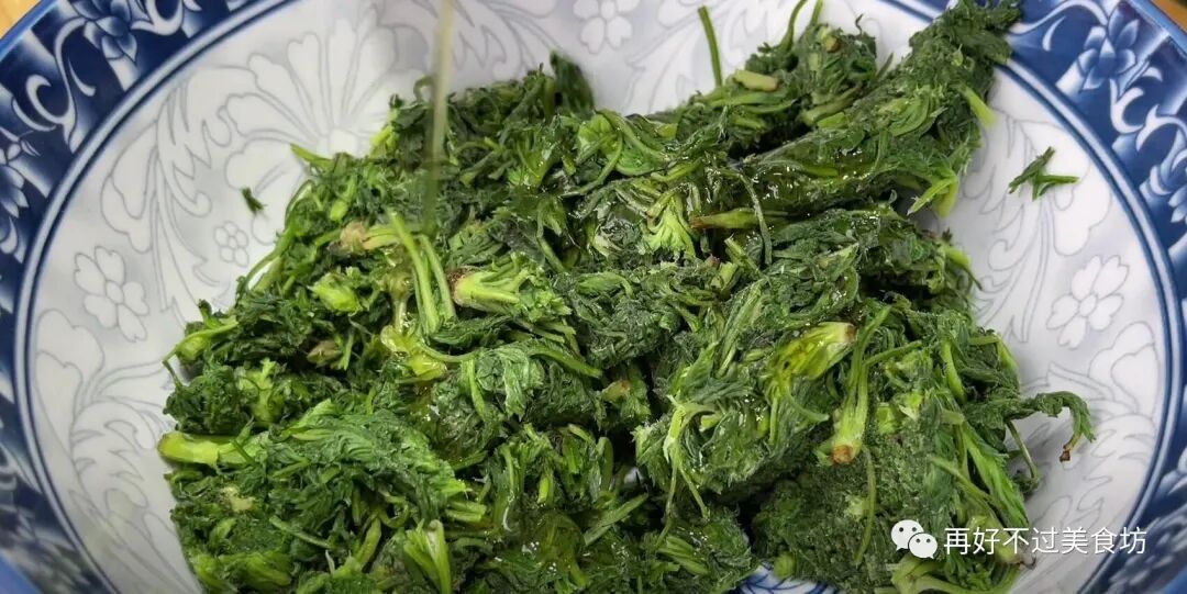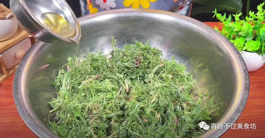 3、下面往白蒿上,加入适量的清油,这样能使蒸出的白蒿颗颗分离,并且也是非常的筋道,用双手将它抓拌均匀。