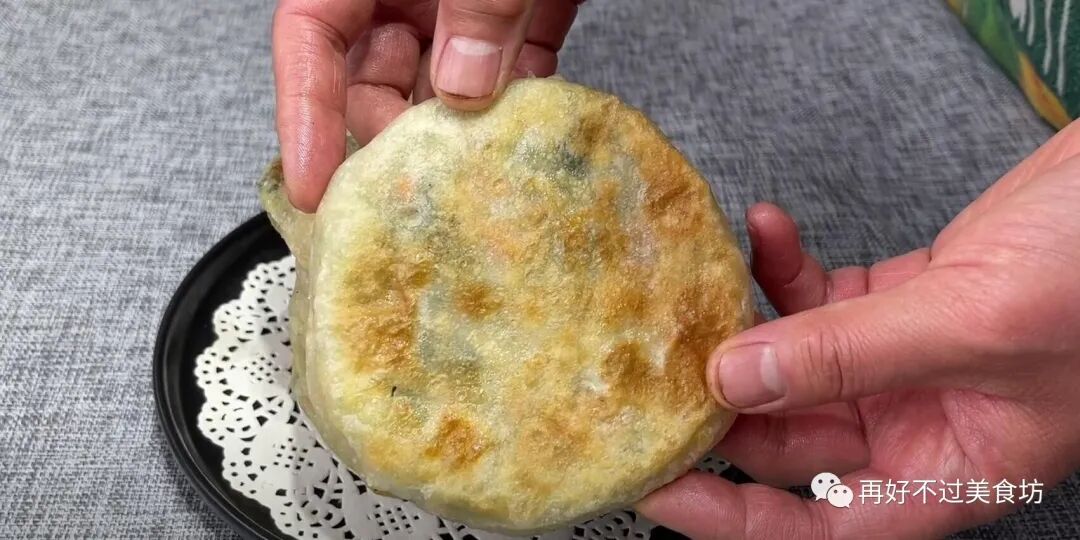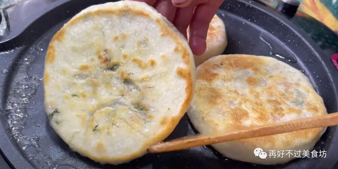 17、烙至一面金黄,就给它翻一次面,继续盖上盖子再烙两分钟,来回翻面两次到三次,把这饼烙至两面金黄,就熟了。