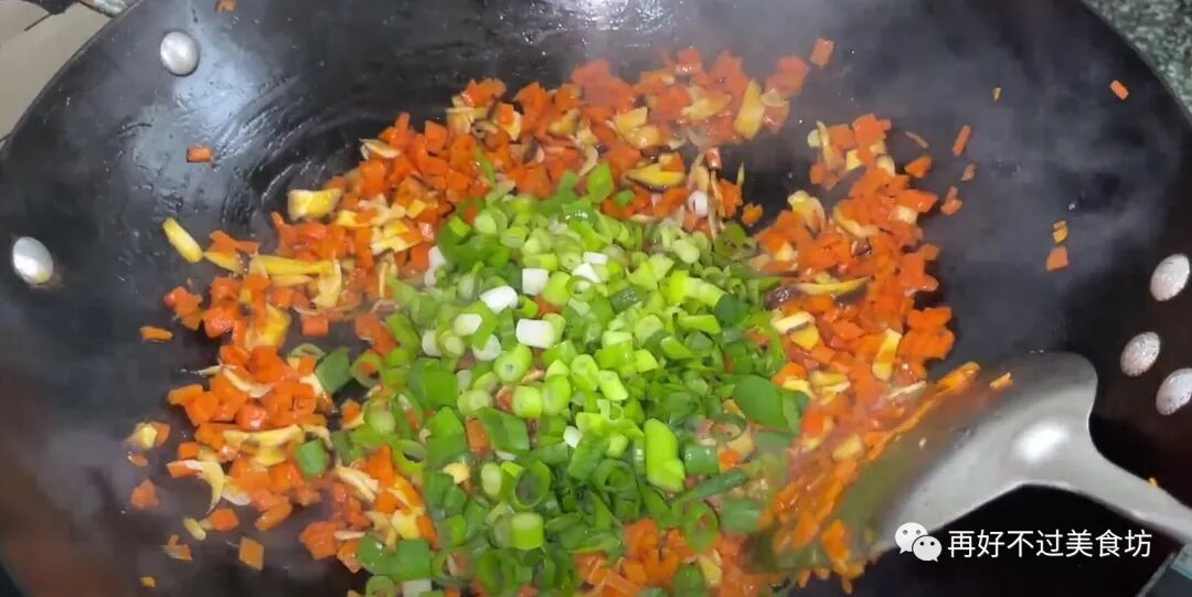 11、接着把炒好的香菇丁和胡萝卜丁往一边扒,再抓入一把虾米,炒好关火,最后再把切好的葱花倒进来,用锅的余温把葱花炒出香味。