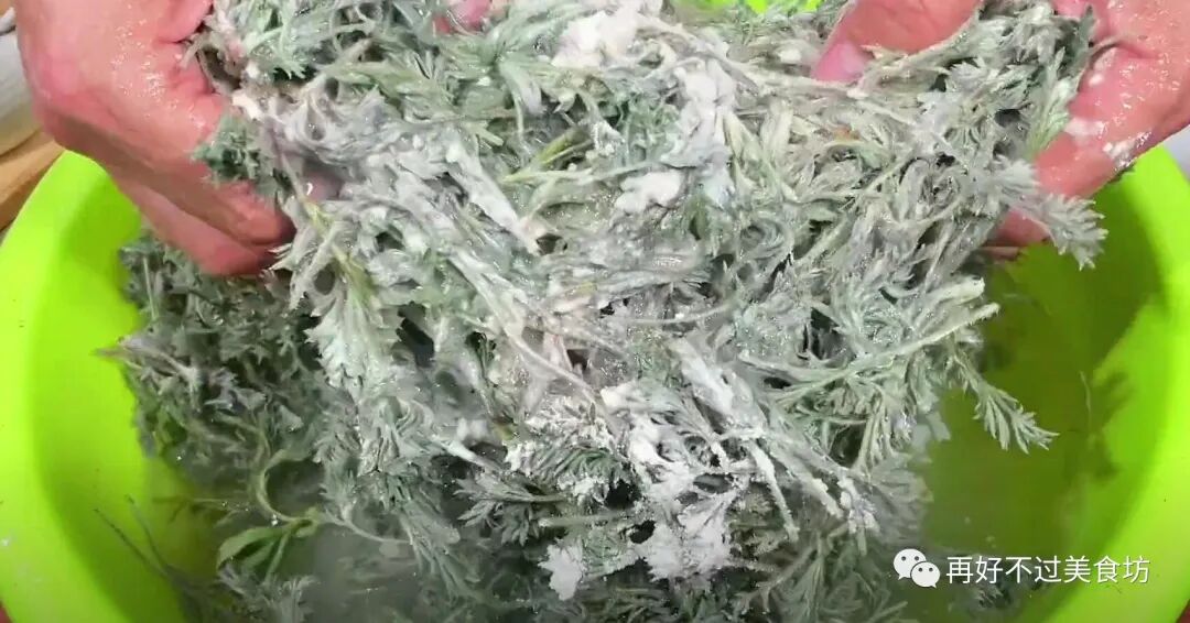 4、下面再少量多次地加入一些面粉,用面粉蒸出来的白蒿,口感会更加劲道,并且也不会粘连在一起。