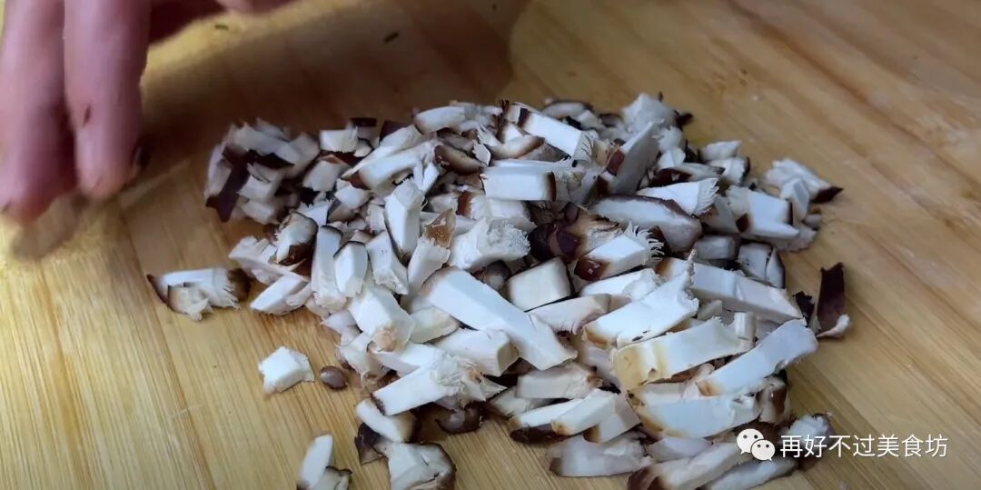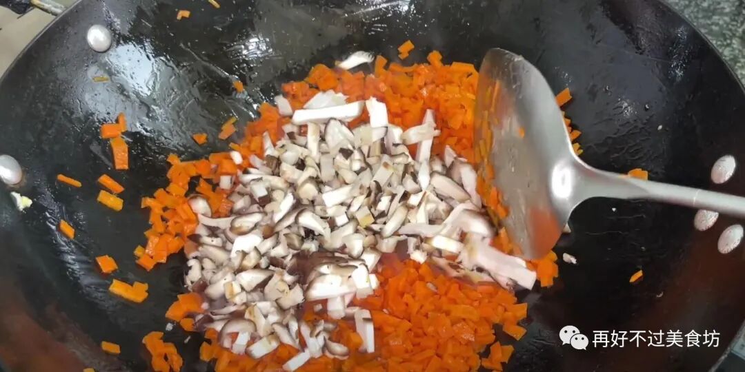 10、炒鸡蛋的锅不用洗,先倒入点油,油热以后,把胡萝卜丁倒进来,翻炒均匀,把胡萝卜丁炒软,再把切好的香菇丁倒进来,翻炒均匀,翻炒一分钟,把香菇炒软。
