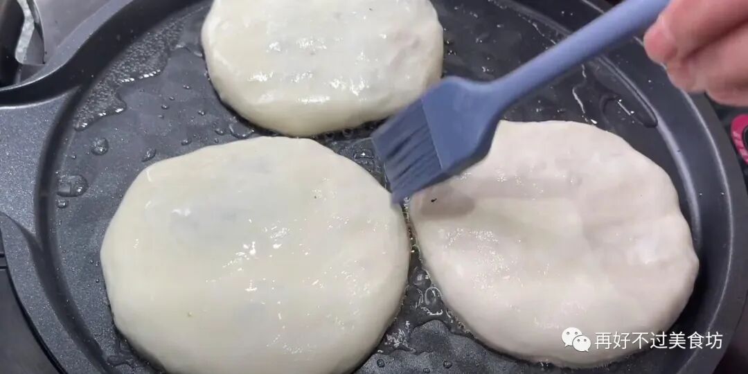 16、电饼铛提前预热,刷上油,把做好的生胚放进来,然后在表面再刷上一层油,锁住水分,盖上盖子,开中火烙两分钟。