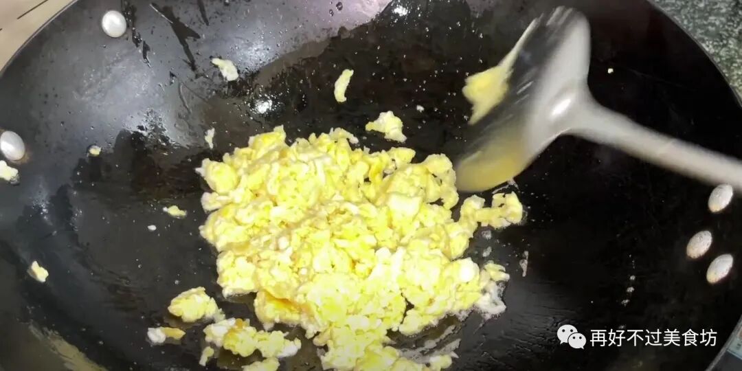 9、下一步等锅烧热,把油倒进去,热锅凉油,油热后把鸡蛋液倒进来,迅速地把鸡蛋液炒成鸡蛋碎,炒好后,先盛出来放一边备用。