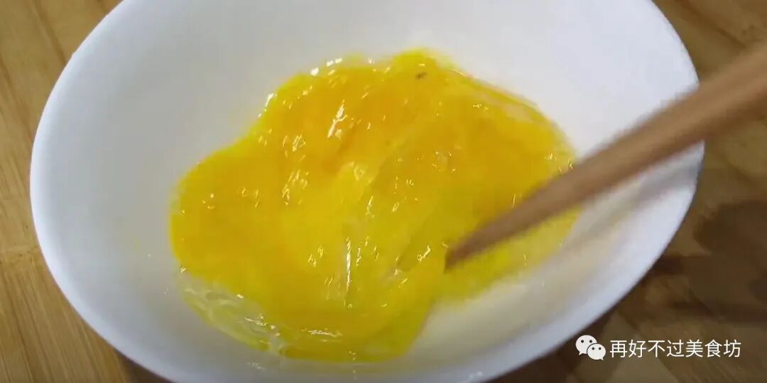 8、再向另一个碗中打入两个鸡蛋,不用加入盐调味,直接用筷子搅散,搅均匀,就先放在一旁备用。