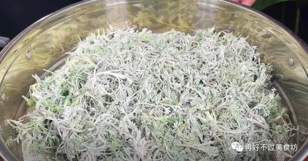 8、这时的白蒿也已经蒸好了,打开锅盖,一股清香味扑面而来,我们来看一下,颗颗分离,非常的有弹性。