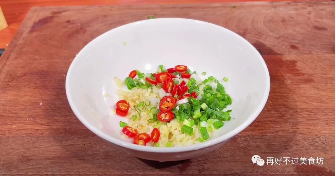 6、准备一些大蒜,给它剁成蒜蓉,再拿出一些小香葱,将它切成葱花,喜欢吃辣的朋友,还可以准备一个小米辣,将它切成均匀的辣椒圈,切好后,和蒜蓉、葱花装入一个碗中。