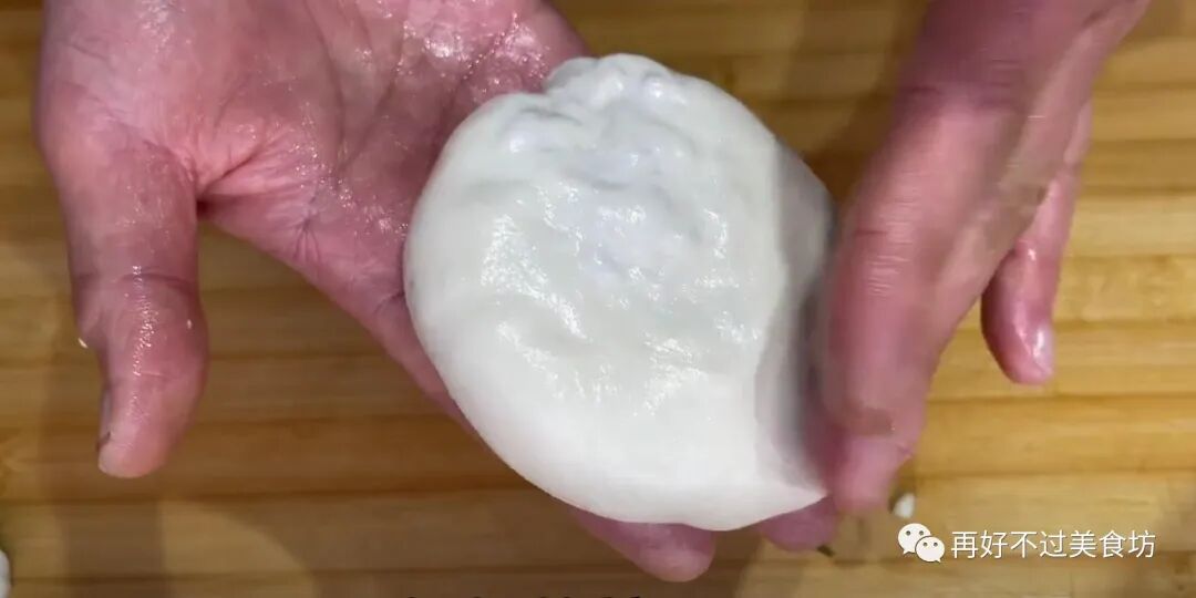 15、最后再包起来,一边提拉,一边捏褶子,另外一只手把馅料按下去,最后再把口收紧,防止露馅,包好反过来放在手里边,再轻轻地按一下,按成一个小圆饼的形状。