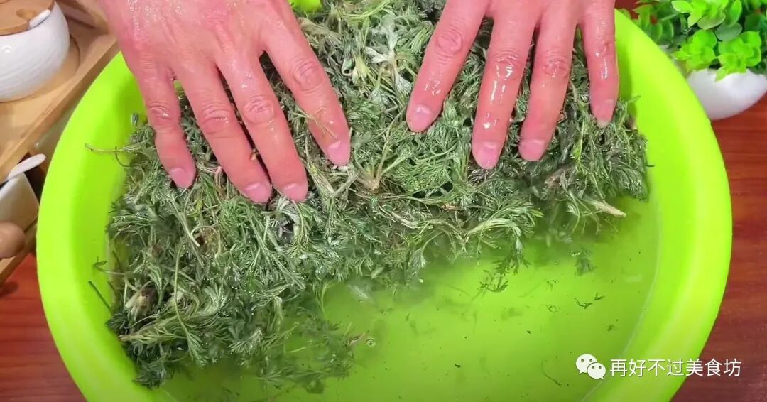 2、接下来用手将白蒿抓洗干净,这个白蒿比较脏,我们要反复地多洗几遍,全部洗好以后,控干水分,再次装入盆中。