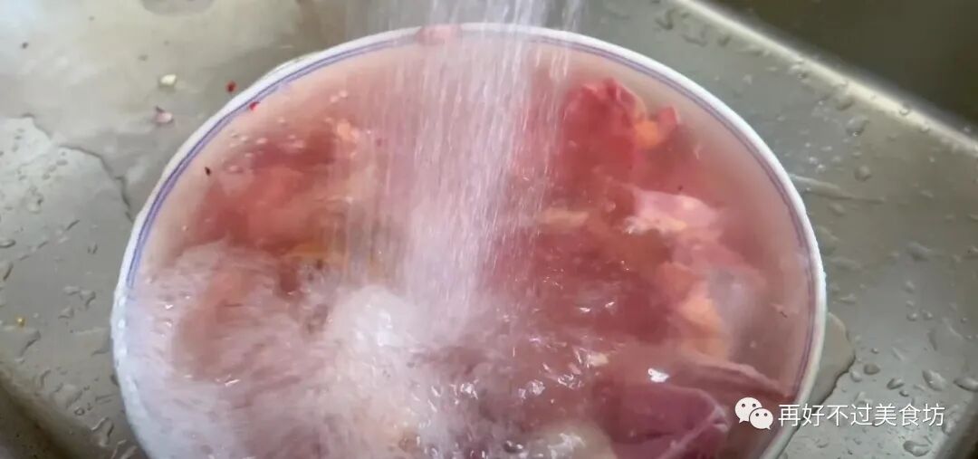 3、把血水冲干净,炖出来基本上没有什么浮沫,就这样用水冲,冲个十分钟,血水基本上没了,到时候再抓一抓,拌一拌,血水全部出来了。