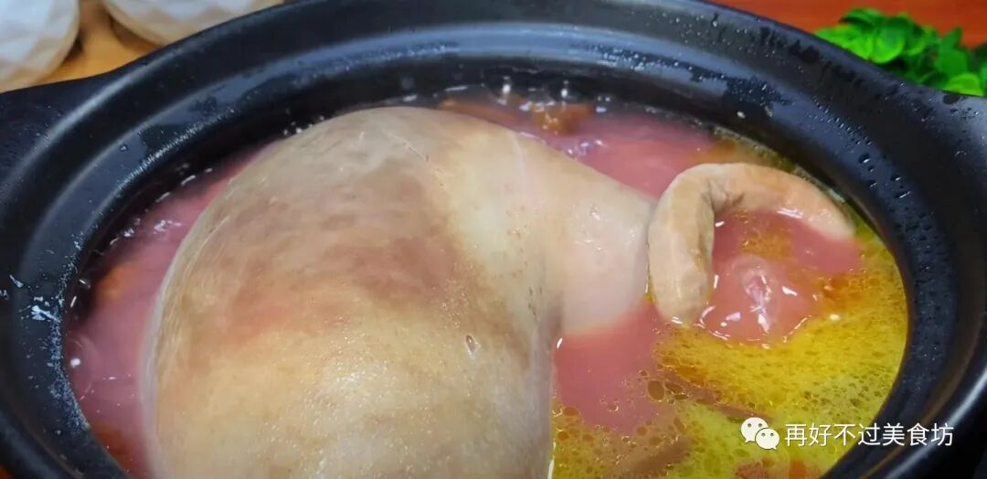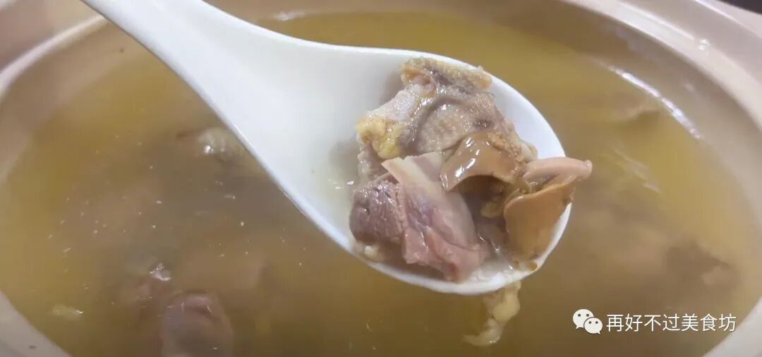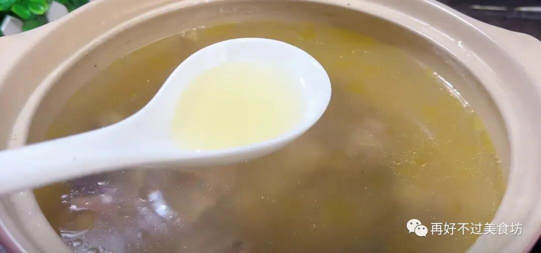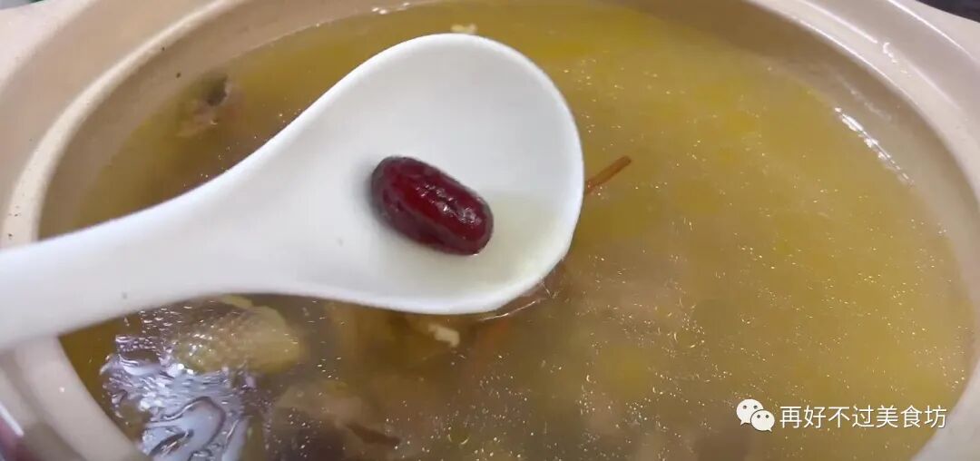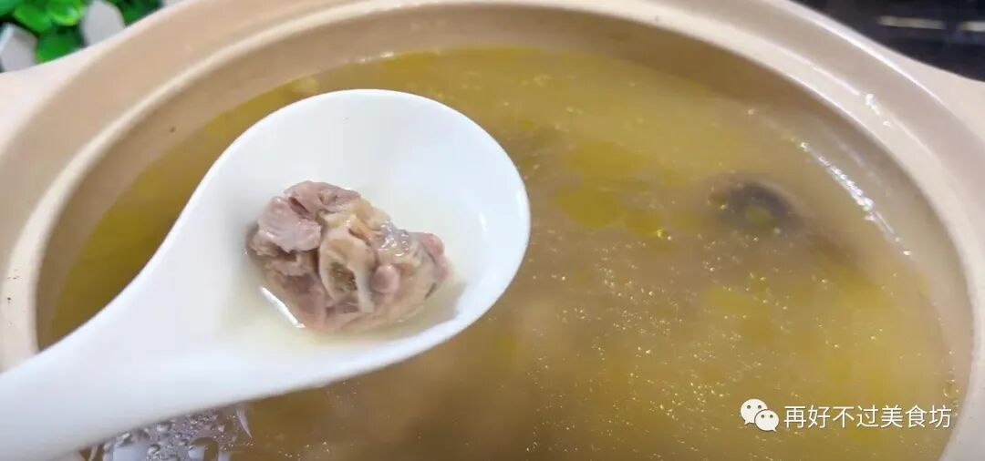 7、时间到了,这个汤就像保温的一样,热汤青黄澄澄的,肉一掐就烂,喝起来有一种很好喝的味道,也就是这个养生的药材起的作用,加上肉炖出来的汤,有很不错的味道,喝了还想喝的感觉。