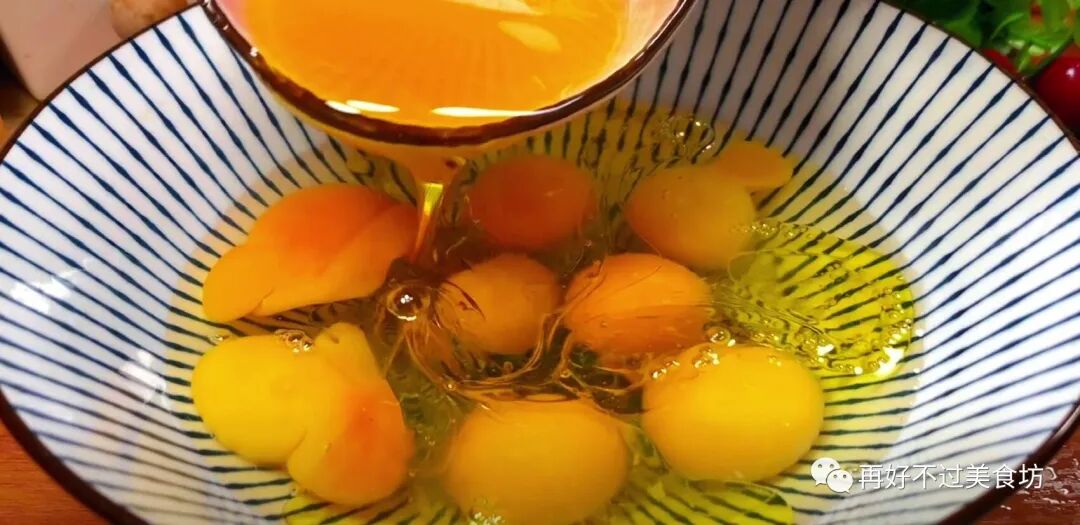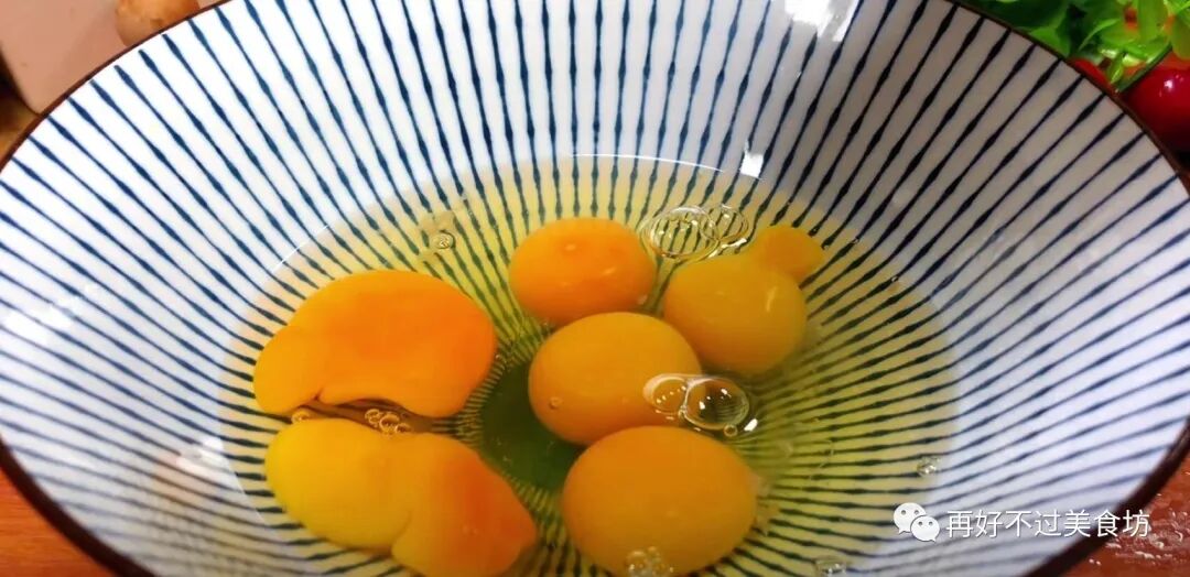 4、准备八个鸡蛋,把它敲入碗中,不急着搅散,而是先放着一遍备用。