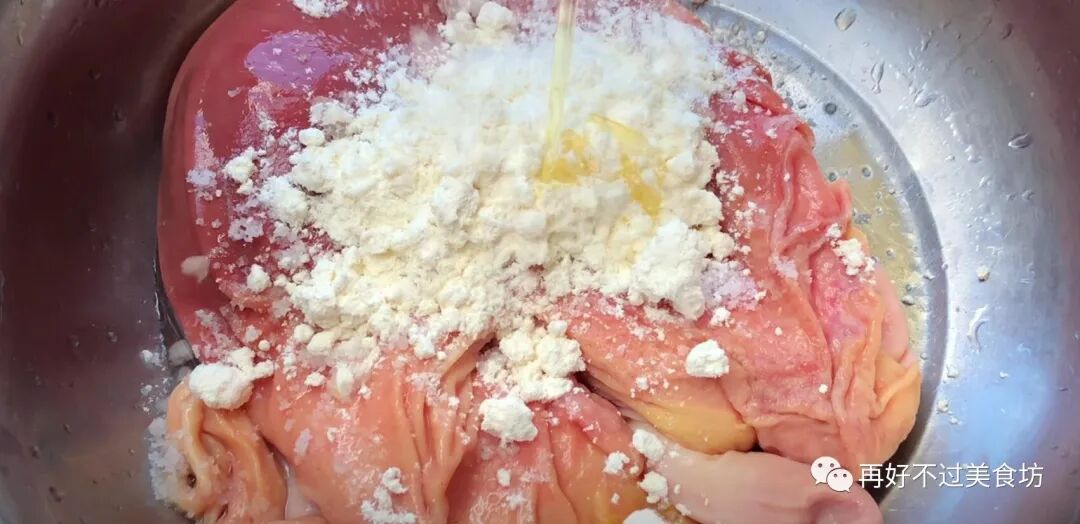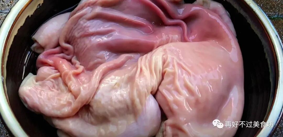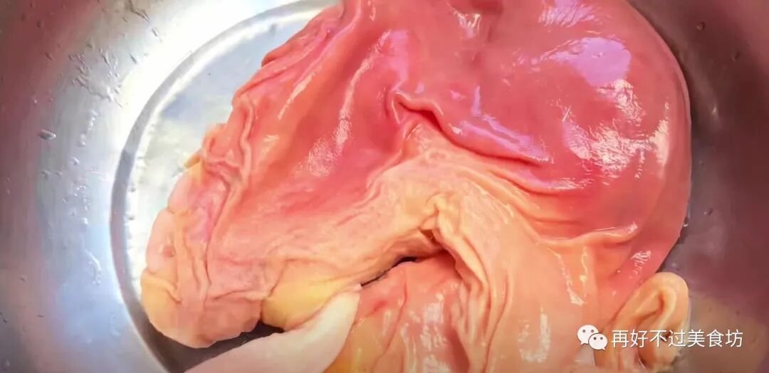 2、猪肚我一般会加盐、面粉和油,给它抓洗,这一面用同样的方法洗两遍,就很干净了,先用清水洗净胃管上的白色黏膜,再用开水烫一下,然后用刀刮一下就可以了。