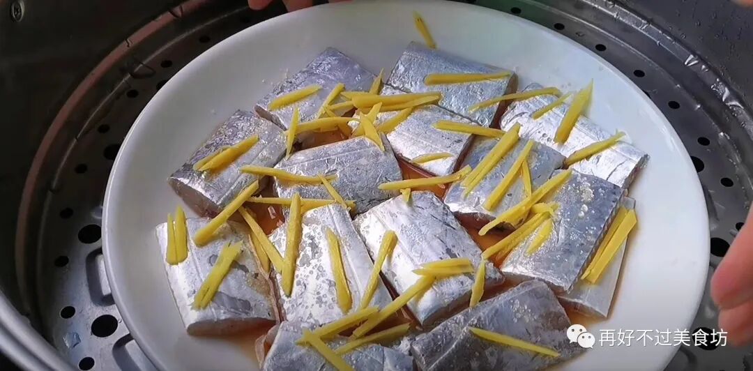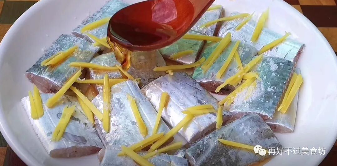 4、再切一些姜丝,把姜丝均匀地铺在带鱼的上面,再撒上少许盐,给带鱼增加一个底味,然后淋入一勺黄酒去腥。
