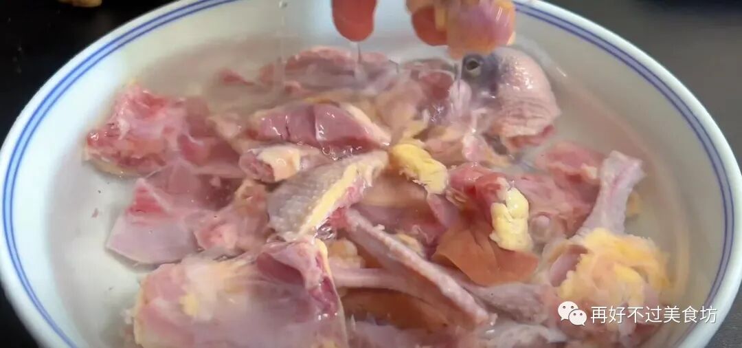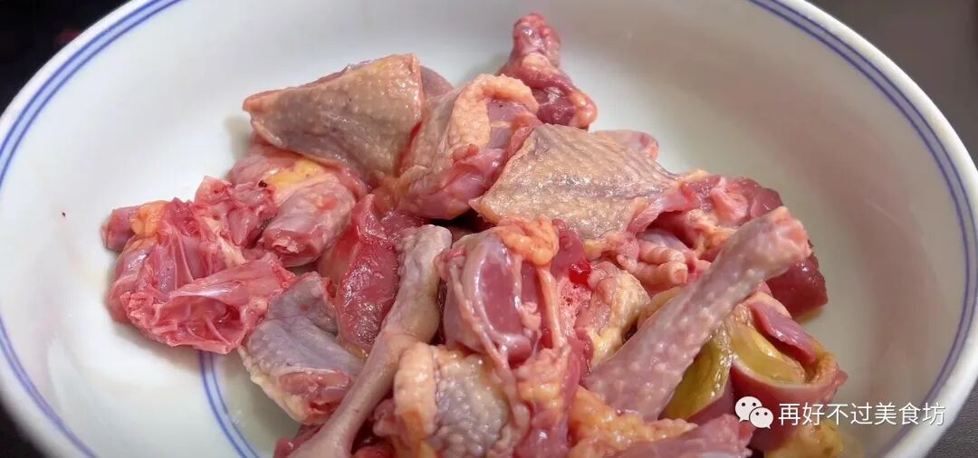 2、处理干净以后,把它砍成块,还要记住把淋巴也要切掉,这个是不能吃的,砍好的鸽子放入盆中,千万不要直接焯水,只用把血水冲干净就可以炖了。
