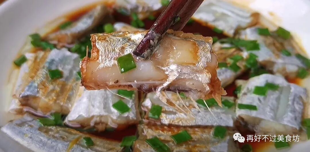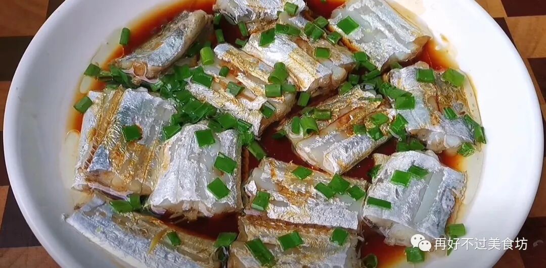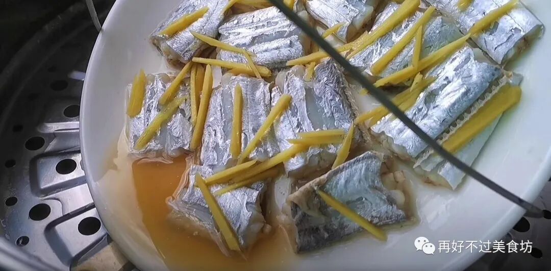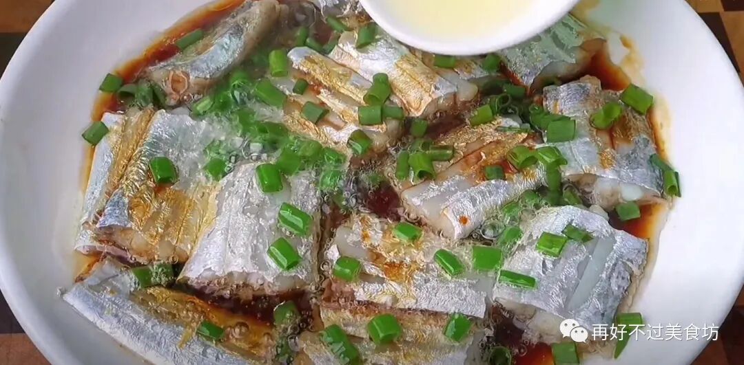7、下一步把姜丝夹掉,再撒入一些迷人的葱花,好看又好吃,接着淋入一勺蒸鱼豉油。