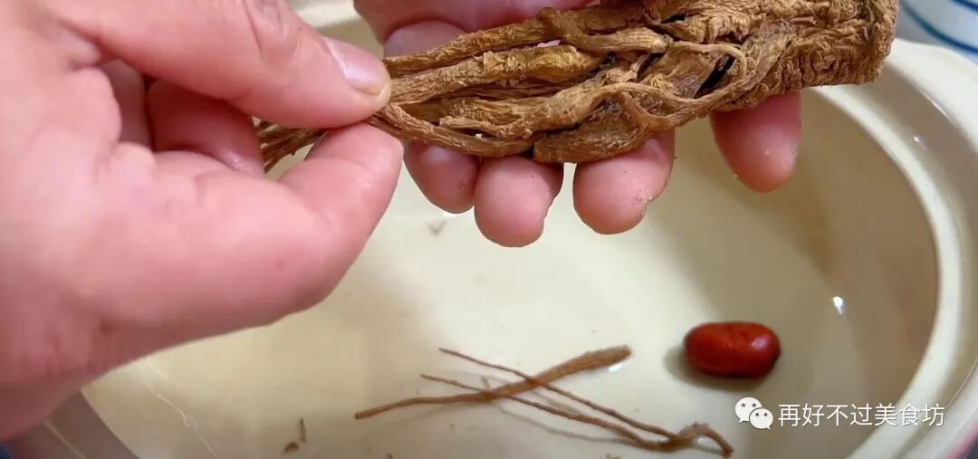 5、下来准备汤料,一是红枣少不了,二是人参须拔两根,天冷了,要养生就用它来养生,知道的人都知道它的好处,只需在它表面拔两根胡须就行了,好吃得很,汤味浓正,而且对身体好。