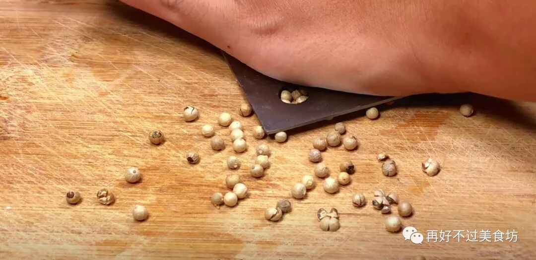 8、再来准备一点白胡椒粒,把它压碎一点,然后就放一旁留着备用。