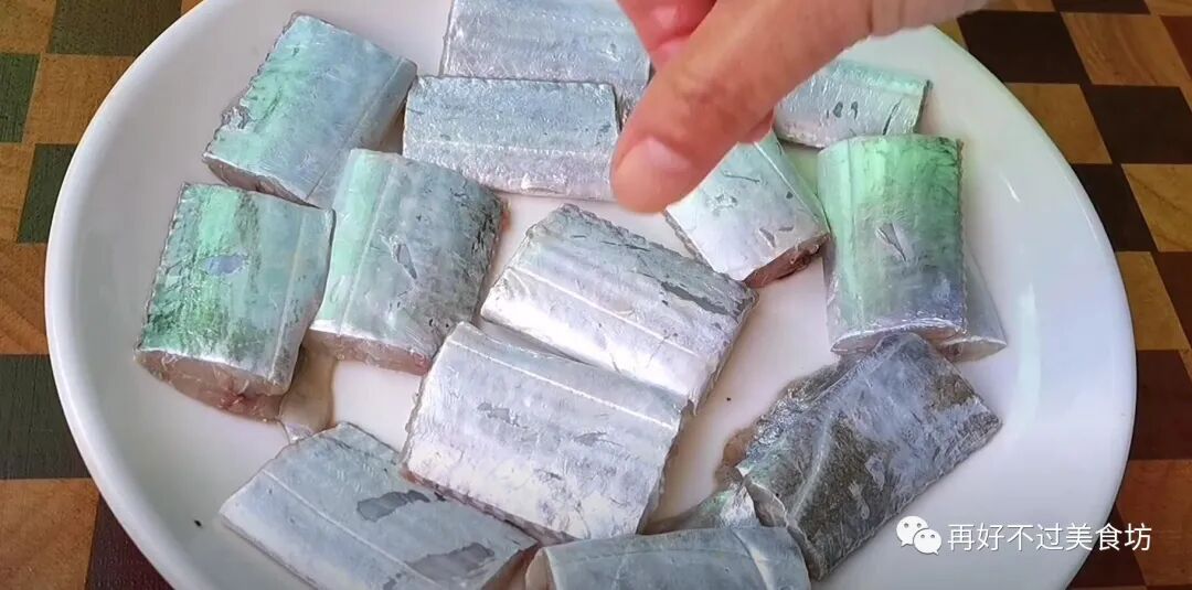 3、带鱼营养非常的丰富,含有大量的蛋白质及维生素A,能够补充身体营养各种成分,全部切好后,把它整齐地摆好在盘子里。