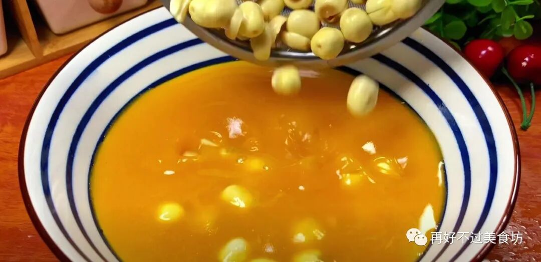 6、然后再把鸡蛋液给它过筛一遍,那样子会更加细腻,这边提前泡了点莲子,也加入鸡蛋液中。