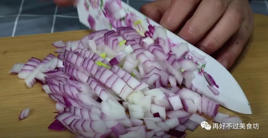 1、把洋葱清洗干净,先是切成块,然后改刀切碎,切好之后,就放碗里备用。