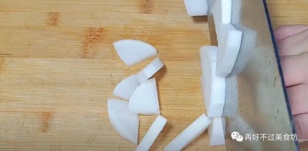 5、因为这个萝卜皮不太新鲜,所以把皮削去不要,然后再将它一切为二,二切为四,再切成约半公分的厚片,都切好后,直接将它放进砂锅中。