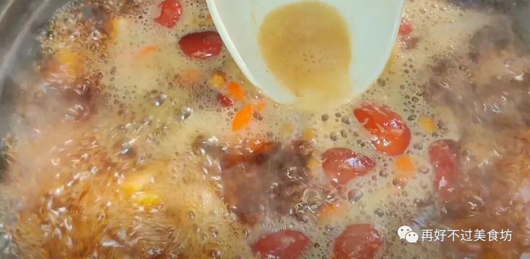 9、最后多加入一些山泉水,用纯净水也可以,开大火烧开,打浮沫,再改成小火,盖上盖子煮上20多分钟。