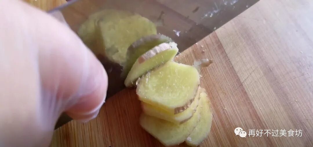 5、准备一小块老姜,老姜的表皮比较厚,切开里面有许多粗的纤维,用老姜的效果比较好一点,把姜切成薄片。
