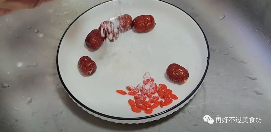 3、接下来在大枣和枸杞中,加入少许食盐和面粉,食盐可以杀菌,面粉有吸附作用,用手抓几下,再用流水冲洗干净,就可以洗干净了,花椒也用水冲洗一下备用。
