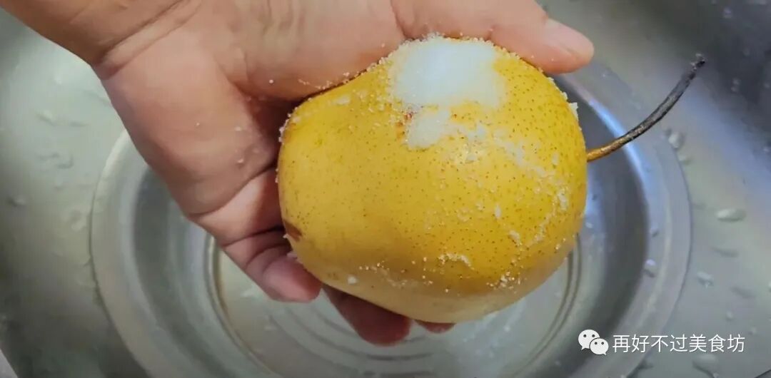 2、在雪梨上撒一点食用盐,然后好好搓洗一下,梨皮营养丰富,就不去皮了,搓好后再用流水冲洗干净,放在一旁备用。