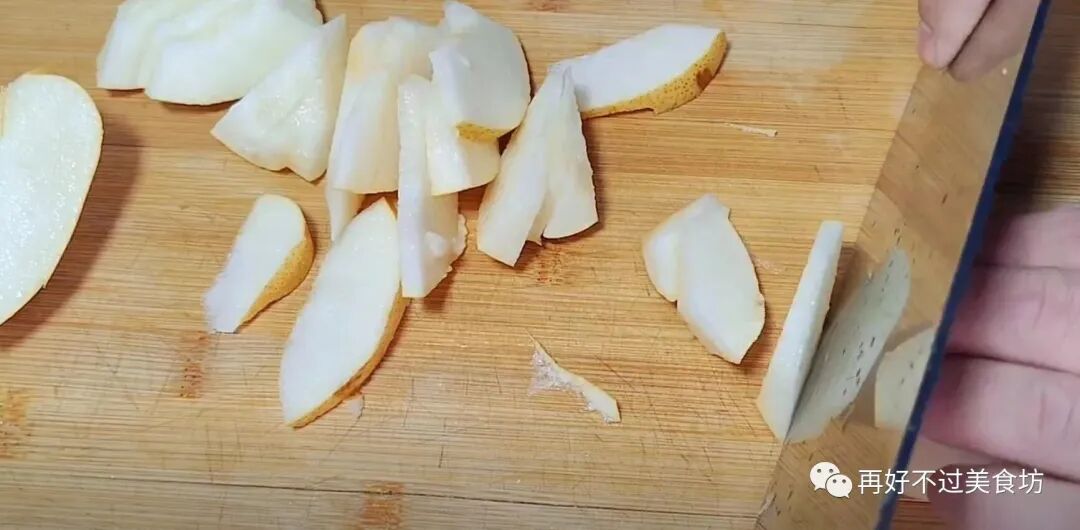 6、接下来把梨先对半切开,再切成四瓣,去掉梨尾巴和梨核,因为梨核比较酸,所以就不要了,都切完后,再将梨改刀切成片,都切好后,也将它放入砂锅中。