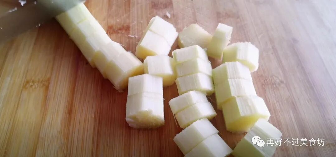 4、再将甘蔗削去外皮,洗净后切成小块,也放进碗中放一旁备用。