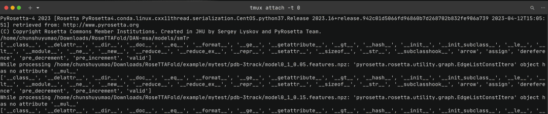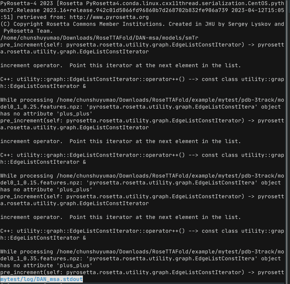 While processing /home/chunshuyumao/Downloads/RoseTTAFold/example/mytest/pdb-3track/model0_0_0.15.features.npz: 'pyrosetta.rosetta.utility.graph.EdgeListConstItera' object has no attribute 'plus_plus'