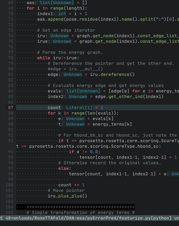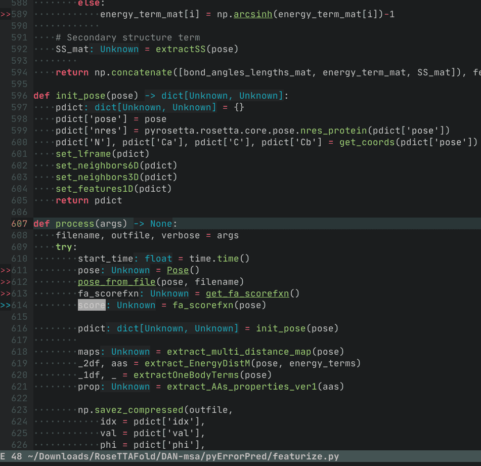 跳转之后我来到了 process 函数的定义:DAN_msa/pyErrorPred/featurize.py 文件的第 607 行。继续查看。接下来的查看是没有任何技巧的,因为报错给的信息基本等于没有。