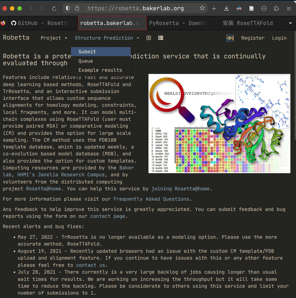 RoseTTAFold 开源,可到 GitHub 下载代码源码在本地搭建,也可在网上使用。Baker 团队搭建了一个在线版本,可以到 RoseTTAFold server[2] 体验。