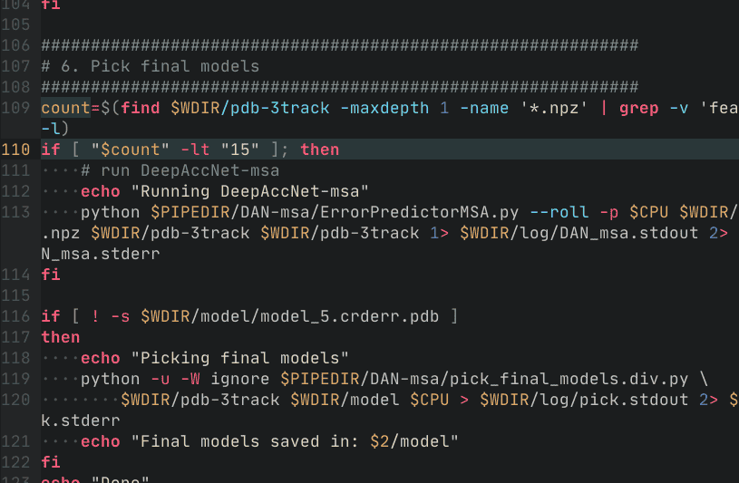 106 ############################################################107 # 6. Pick final models108 ############################################################109 count=$(find $WDIR/pdb-3track -maxdepth 1 -name '*.npz' | grep -v 'features' | wc -l)110 if [ "$count" -lt "15" ]; then111 # run DeepAccNet-msa112 echo "Running DeepAccNet-msa"113 python $PIPEDIR/DAN-msa/ErrorPredictorMSA.py --roll -p $CPU $WDIR/t000_.3track.npz $WDIR/pdb-3track $WDIR/pdb-3track 1> $WDIR/log/DAN_msa.stdout 2> $WDIR/log/DAN_msa.stderr114 fi