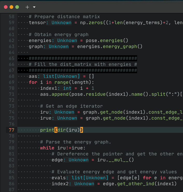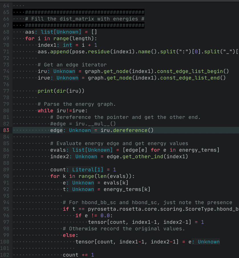 ####################################### Fill the dist_matrix with energies #######################################aas = []for i in range(length): index1: int = i + 1 aas.append(pose.residue(index1).name().split(":")[0].split("_")[0]) # Get an edge iterator iru = graph.get_node(index1).const_edge_list_begin() irue = graph.get_node(index1).const_edge_list_end() # Parse the energy graph. while iru!=irue: # Dereference the pointer and get the other end. #edge = iru.__mul__() # ↓↓↓↓↓↓↓↓↓修改这里↓↓↓↓↓↓↓↓↓↓↓↓ edge = iru.dereference()