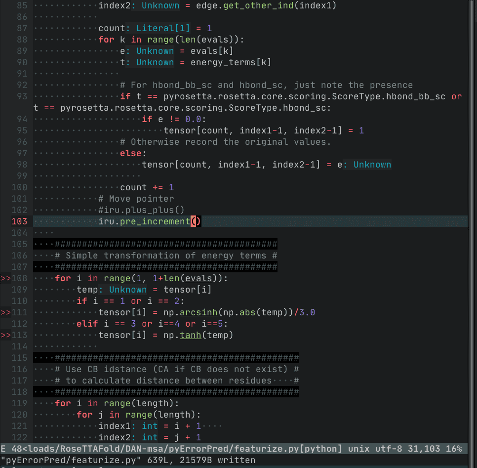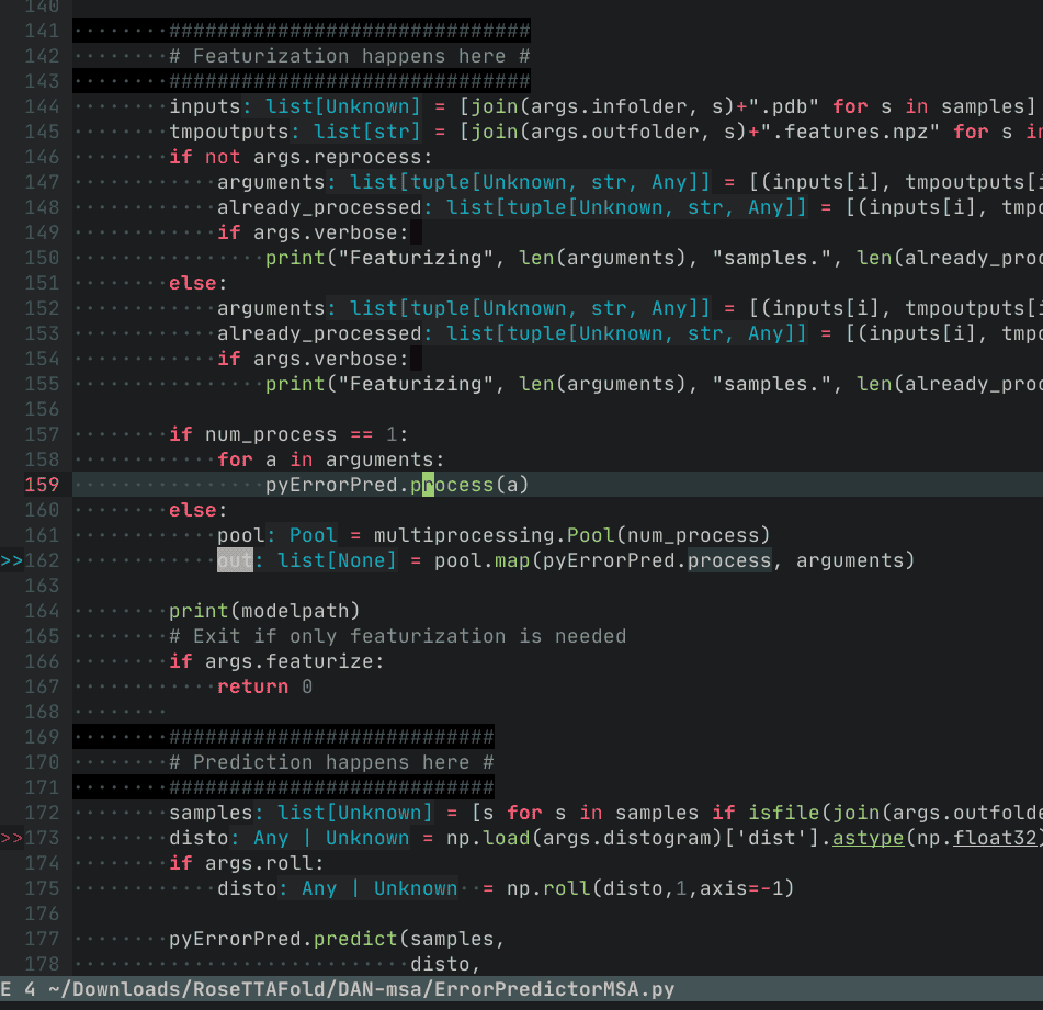 自己动手,丰衣足食,直接看代码。我们运行的是 run_pyrosetta_ver.sh 文件,故此查看。找到输出 DAN_msa.std[err,out] 文件的那一行,调用的是 ErrorPredictorMSA.py,然后出错。那就简单,直接找到这个文件,在 RoseTTAFold/DAN_msa 文件夹下。