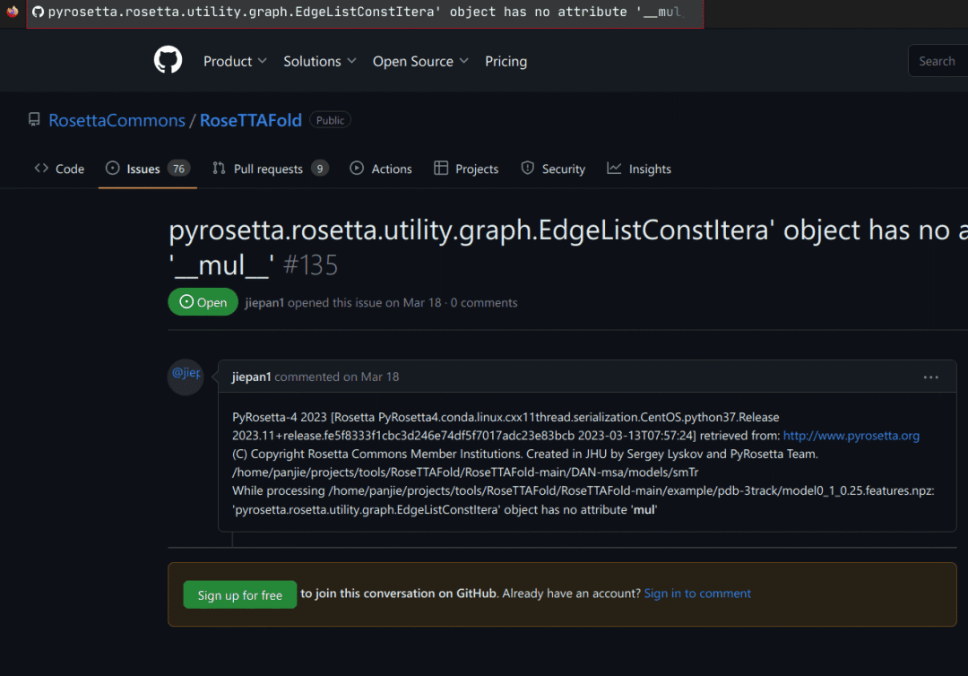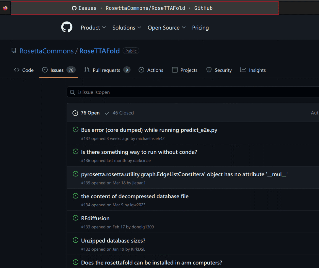碰到问题不要去百毒搜索,我们先去官网看看是不是有人遇到了同样的情况。源码发布在 GitHub,先去 GitHub 查看。打开 RoseTTAFold 的 GitHub 主页,点击 Issues 查看问题。被解决的问题一般在 Closed,未解决的在 Open。