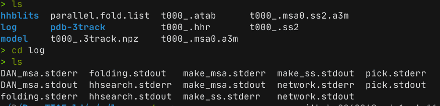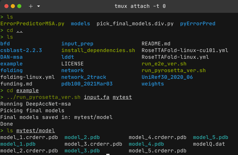 $ pwd/home/chunshuyumao/Downloads/RoseTTAFold$ cd example$ mkdir -pv mytest$ ../run_pyrosetta_ver.sh input.fa mytest