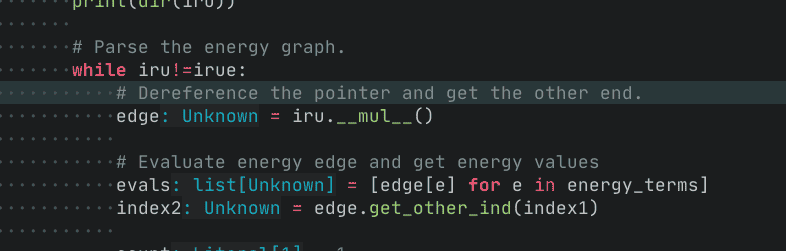 它没有定义这个操作符我们无法使用。仔细看上面的属性发现,有一个属性是 dereference,恰好就是解引用的意思。搞不好就是?其实就是了。这应该是代码重构后没改过来的部分。于是我们把 edge = iru.__mul__() 改为 edge = iru.dereference()。