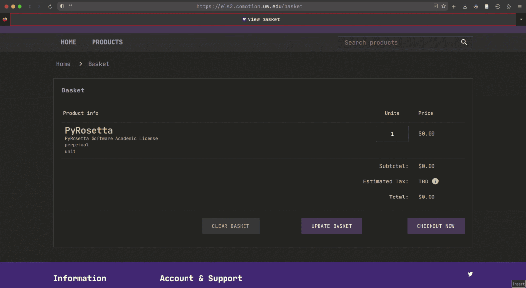 要使用 PyRosetta 需要注册一个账号。到华盛顿大学[11]下载。根据我给的网址进入,可以看到如下界面。点击右下角的 ORDER NOW 即可。ORDER 后进入确认界面,再次点击 CHECKOUT NOW,进入登陆界面。