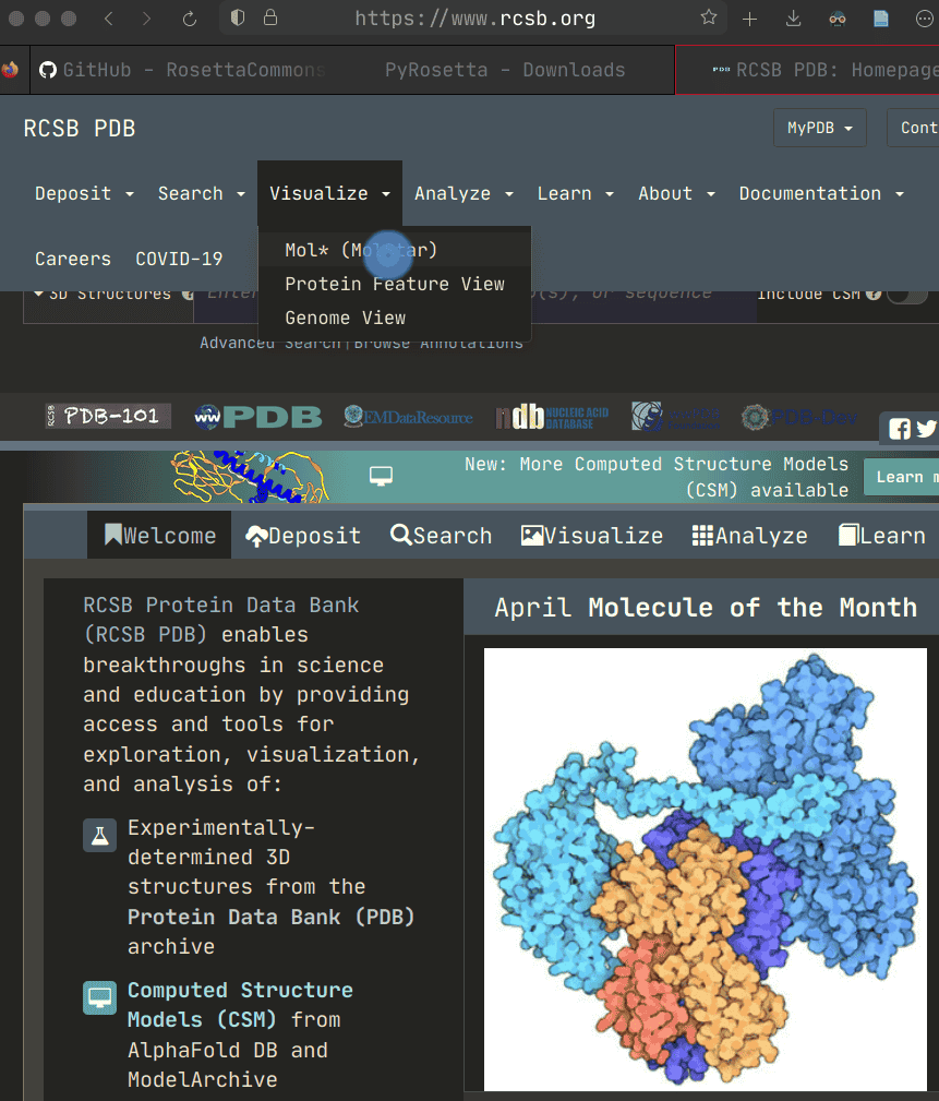 浏览器打开 RCSB,选择“可视化”(Visualize)中的 Mol*(MolStar)进行可视化。