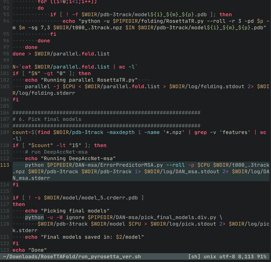 106 ############################################################107 # 6. Pick final models108 ############################################################109 count=$(find $WDIR/pdb-3track -maxdepth 1 -name '*.npz' | grep -v 'features' | wc -l)110 if [ "$count" -lt "15" ]; then111 # run DeepAccNet-msa112 echo "Running DeepAccNet-msa"113 if ! python $PIPEDIR/DAN-msa/ErrorPredictorMSA.py --roll -p $CPU $WDIR/t000_.3track.npz $WDIR/pdb-3track $WDIR/pdb-3track 1> $WDIR/log/DAN_msa.stdout 2> $WDIR/log/DAN_msa.stderr; then114 echo "run DeepAccNet-msa: Error!"115 exit 1116 fi117 fi