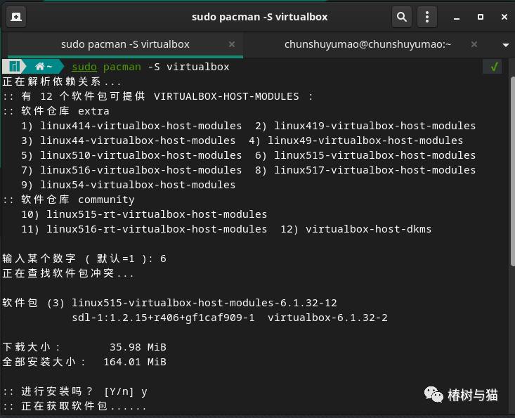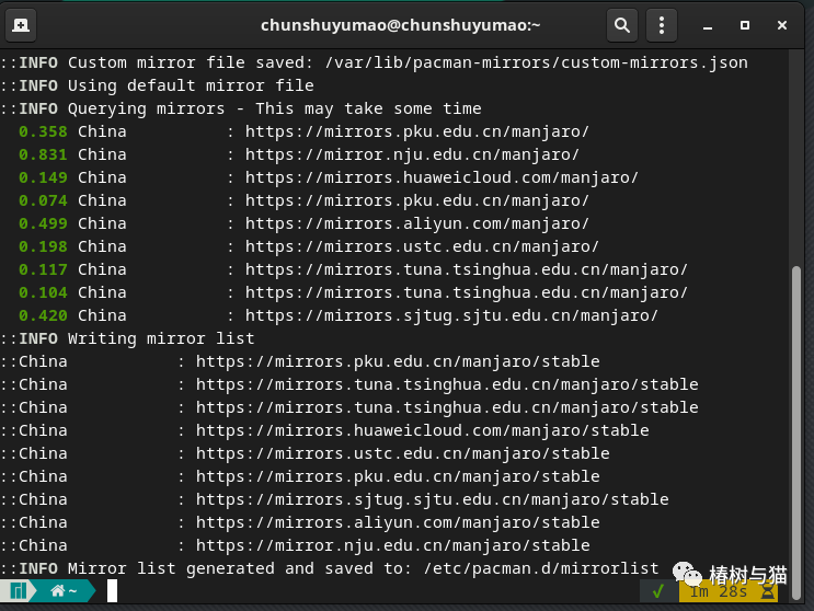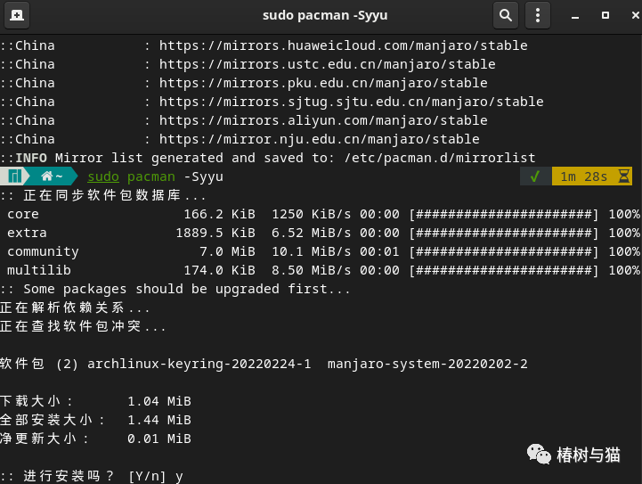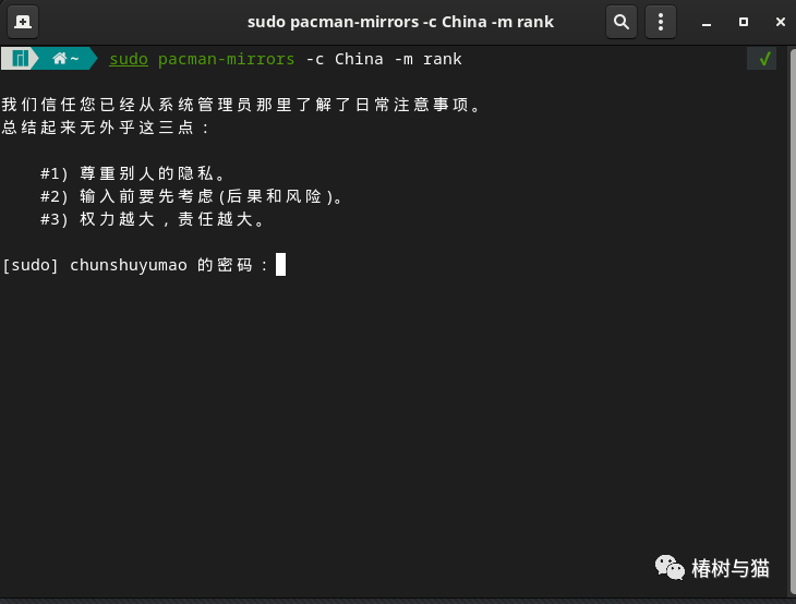 其中,sudo允许你行使管理员的命令,pacman-mirrors是选择最快源的命令;-c是指定地区,这是使用中国;-m是方法,我们选择rank,就是把速度最快的挪到前面。它会要求你输入你的密码,注意,输入密码的时候你是看不到反馈的——也就是说,你开不到自己输入的密码,那里黑漆漆的一片。