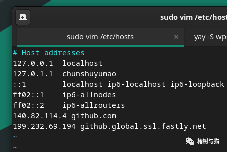 安装完yay之后,由于我们下载的软件可能会在github上(例如后面的WPS的配件),所以配置一下github的DNS,毕竟国内上网不容易。